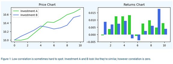 Importantly, two investments that both deliver positive long-term returns can nevertheless exhibit zero or even negative correlation. Conversely, investments that appear to move in opposite directions over time can be positively correlated. For example, daily price movements may show a very different relationship from the point to point one-year return.
