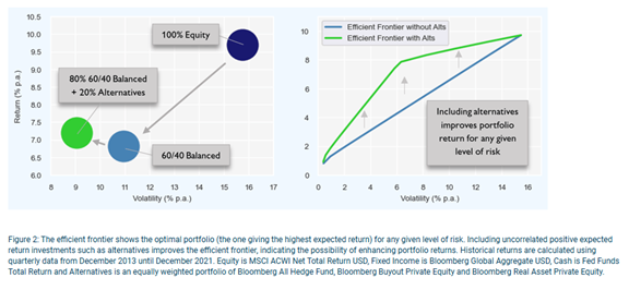 Correlation and diversification are particularly central to the second category of diversifying alternatives. Investments with low correlation can materially improve portfolio outcomes by reducing volatility without sacrificing expected returns. Diversifying alternatives can therefore allow investors to achieve better risk adjusted returns rather than simply higher absolute returns, improving the efficiency and resilience of the portfolio as a whole. In this sense, alternatives that consistently deliver diversification benefits can be among the most valuable long term building blocks in a well constructed investment portfolio.
