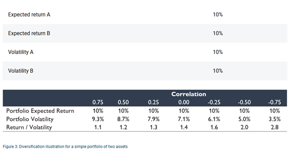 Figure 3 shows that when these investments are highly correlated, combining them does little to reduce portfolio risk. However, when correlation is low or even negative, portfolio volatility drops to levels far below that of either A or B individually, even though expected returns remain the same. This leads to higher risk adjusted returns – the portfolio earns the same return with less volatility.