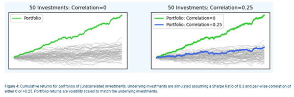 The effect becomes even more powerful in larger diversified portfolios. Consider an equally weighted portfolio of 50 completely uncorrelated investments, all with the same ex-ante expected return and ex-ante volatility and a modestly positive Sharpe Ratio2 of 0.3. The portfolio returns are shown by the green line on the left-hand chart, and the Sharpe Ratio is now 1.94, a significant improvement on any individual investment. However, even a small increases in correlation can significantly dilute these benefits. If these 50 investments now have a pair-wise correlation of 0.25 (still a relatively low correlation), the cumulative portfolio return becomes dramatically lower than when correlation was zero, as shown by the blue line in the right-hand chart.