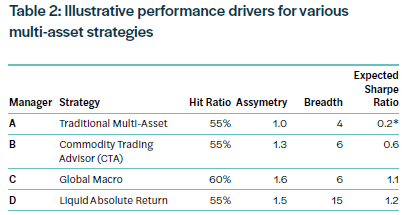 In the absence of trade-by-trade attribution, the example in Table 2 uses the monthly returns of different multi-asset approaches to crudely estimate their hit ratio (percentage of winning months) and asymmetry (size of the average winning month relative to the average losing month). Since breadth is difficult to glean from monthly returns, we instead imply breadth using the other estimated parameters and the realised Sharpe ratio, which is known. A much more accurate picture could be obtained using actual trade-by-trade data, which we do for our own portfolios.